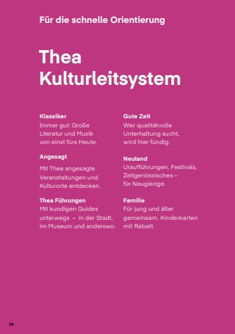 10KlassikerImmer gut: Gro%u00dfe Literatur und Musik von einst f%u00fcrs Heute. AngesagtMit Thea angesagteVeranstaltungen undKulturorte entdecken.Thea F%u00fchrungenMit kundigen Guides unterwegs %u2013 in der Stadt, im Museum und anderswo.Thea KulturleitsystemF%u00fcr die schnelle Orientierung Gute Zeit Wer qualit%u00e4tvolleUnterhaltung sucht,wird hier f%u00fcndig.NeulandUrauff%u00fchrungen, Festivals, Zeitgen%u00f6ssisches %u2013 f%u00fcr Neugierige.FamilieF%u00fcr jung und %u00e4ltergemeinsam. Kinderkartenmit Rabatt.
