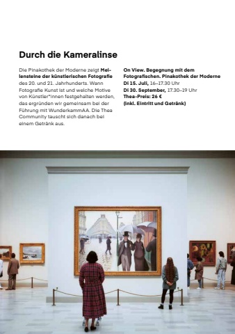20Durch die KameralinseDie Pinakothek der Moderne zeigt Meilensteine der k%u00fcnstlerischen Fotografie des 20. und 21. Jahrhunderts. Wann Fotografie Kunst ist und welche Motive von K%u00fcnstler*innen festgehalten werden, das ergr%u00fcnden wir gemeinsam bei der F%u00fchrung mit WunderkammAA. Die Thea Community tauscht sich danach bei einem Getr%u00e4nk aus.On View. Begegnung mit dem Fotografischen. Pinakothek der ModerneDi 15. Juli, 16%u201317.30 UhrDi 30. September, 17.30%u201319 Uhr Thea-Preis: 26 %u20ac (inkl. Eintritt und Getr%u00e4nk)