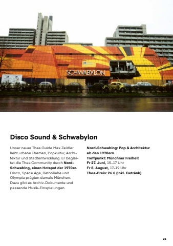 21Stylez!Disco Sound & SchwabylonUnser neuer Thea Guide Max Zeidler liebt urbane Themen, Popkultur, Architektur und Stadtentwicklung. Er begleitet die Thea Community durch NordSchwabing, einen Hotspot der 1970er.Disco, Space Age, Betonliebe und Olympia pr%u00e4gten damals M%u00fcnchen. Dazu gibt es Archiv-Dokumente und passende Musik-Einspielungen.Nord-Schwabing: Pop & Architektur ab den 1970ern. Treffpunkt: M%u00fcnchner FreiheitFr 27. Juni, 15%u201317 Uhr Fr 8. August, 17%u201319 UhrThea-Preis: 26 %u20ac (inkl. Getr%u00e4nk)