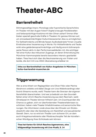28Thea hat Karten f%u00fcr Ulrich Rasches Agamemnon, eine bildgewaltige Inszenierung mit Live-Musik, S. 14Infos zur Barrierefreiheit von Kultur-Angeboten in M%u00fcnchen: kultur-barrierefrei-muenchen.deTheater-ABCStimmgewaltige Impro-Monologe oder hypnotische Sprechch%u00f6re im Theater mit den Augen h%u00f6ren? Digital erzeugte Parallelwelten und farbenpr%u00e4chtige Kost%u00fcme mit den Ohren sehen? Immer %u00f6fter bieten speziell geschulte Kr%u00e4fte in Theatern ihr ganzes K%u00f6nnen auf, um sinnesbeeintr%u00e4chtigten Kulturinteressierten dies zu erm%u00f6glichen. F%u00fcr Sehbehinderte und Blinde fassen Audiodeskriptor*innen visuelle Eindr%u00fccke einer Inszenierung in Worte. F%u00fcr H%u00f6rbehinderte und Taube wirkt eine geb%u00e4rdensprachm%u00e4chtige und h%u00e4ufig enorm b%u00fchnenpr%u00e4sente Person aktiv in den Performanceabl%u00e4ufen mit. Als wichtiger Teil einer Kultur des inklusiven Zugangs, an deren Entwicklung die M%u00fcnchner Kammerspiele bereits besonders intensiv gearbeitet haben. Thea freut sich %u00fcber die Neuinszenierung von Tristan und Isolde, die dort mit Live-DGS-%u00dcbersetzung erlebbar ist. TriggerwarnungWer je eine Arbeit von Regiegr%u00f6%u00dfen wie Oliver Frljic oder Marina Abramovic erlebte und dabei Zeuge von Live-Waterboardings oder Suizid-Streams wurde, wei%u00df: Theater kann die Grenzen der eigenen Sensibilit%u00e4t %u00fcberschreiten. Und wer je bet%u00e4ubt von den Soundeffekten einer Ulrich-Rasche-Inszenierung aus dem Resi kam, wei%u00df: Ohrst%u00f6psel im Theater k%u00f6nnen hilfreich sein. Um Zuschauenden die Chance zu geben, sich vor %u00fcberfordernden Theatererlebnissen zu sch%u00fctzen, haben viele Theater Inhaltshinweise und sensorische Warnungen. Sie informieren vorab etwa %u00fcber den Einsatz von Stroboskoplicht oder %u00fcber die Darstellung von Nacktheit und sexualisierter Gewalt. Denn, nur so wird ein Theater zum sicheren Ort, an dem auch Kriegstraumatisierte oder Missbrauchsopfer Teil der k%u00fcnstlerischen W%u00fcrdigung ihres Schicksals sein k%u00f6nnen.Barrierefreiheit