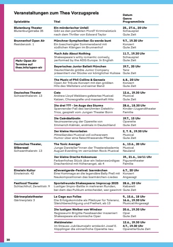 30Spielst%u00e4tteTitelDatumGenreProgrammlinieBlutenburg TheaterBlutenburgstra%u00dfe 35Ein m%u00f6rderischer UnfallGibt es den perfekten Mord? Kriminalst%u00fcck nach dem Thriller von Edward Taylor25., 27.6., 20 UhrSchauspielGute ZeitBrunnenhof Open AirResidenzstr. 1M%u00fcnchner Symphoniker: Es werde buntEin beschwingter Sommerabend mit s%u00fcdlichen Kl%u00e4ngen im Brunnenhof9.7., 19.30 UhrKonzertGute ZeitMuch Ado About NothingShakespeare%u2019s witty romantic comedy, performed by the ADG Europe. In English11.7., 19.30 UhrSchauspielGute ZeitBayerisches Junior Ballett M%u00fcnchenDeutschlands gr%u00f6%u00dfte Junior Company pr%u00e4sentiert vier St%u00fccke vor k%u00f6niglicher Kulisse19.7., 20 UhrTanzGute ZeitThe Music of Phil Collins & GenesisOpen Air Tribute Konzert mit den gr%u00f6%u00dften Hits des Weltstars und seiner Band6.8., 20 UhrKonzertGute ZeitDeutsches TheaterSchwanthalerstr. 13CatsAndrew Lloyd Webbers gefeiertes Musical: Katzen, Choreografie und massenhaft Hits12.6., 19.30 UhrMusicalGute ZeitDie drei ??? - Im Auge des SturmsSpannender Fall des ber%u00fchmten DetektivTrios, gespielt vom Jungen Theater Bonn28.6., 18.30 UhrKinder-/JugendtheaterFamilieDie Cs%u00e1rd%u00e1sf%u00fcrstinNeuinszenierung der Operette von Emmerich K%u00e1lm%u00e1n, erstmals in Deutschland19.7., 15 UhrOperetteGute ZeitDer kleine HorrorladenMitrei%u00dfendes Musical voll schwarzem Humor %u00fcber eine fleischfressende Pflanze2, 7. 8., 19.30 UhrMusicalGute ZeitDeutsches Theater, SilbersaalSchwanthalerstr. 13The Toxic AvengerJunge Darsteller*innen der Theaterakademie August Everding im verr%u00fcckten Rock-Musical6., 13.6., 20 UhrMusicalNeulandDer kleine Drache KokosnussFarbenfrohes St%u00fcck %u00fcber ein liebensw%u00fcrdiges Drachenkind mit H%u00f6henangst, ab 419., 21.6., 16/11 UhrFigurentheaterFamilieEinstein Kultur Einsteinstr. 42aDevantgarde-Festival: Isarm%u00e4rchenEine Hommage an die legend%u00e4re Bally Prell mit Neukompositionen des Isarm%u00e4rchen-Liedes6.7., 20 UhrKonzertAngesagtFastfood TheaterSchlachthof, Zenettistr. 9Sportsfreunde Shakespeare: Improcup 2025Lustiger Impro-Battle in mehreren Runden, bei dem das Pulikum entscheidet, wer gewinnt28.6., 20 UhrKabarettGute ZeitG%u00e4rtnerplatztheaterG%u00e4rtnerplatz 3 La Cage aux FollesDie Erfolgskom%u00f6die als Pl%u00e4doyer f%u00fcr Toleranz, Gleichberechtigung und Freiheit, ab 139., 15.6., 18 Uhr16.6., 19.30 UhrMusical/AngesagtDie lustigen Weiber von WindsorRegisseurin Brigitte Fassbaender inszeniert Shakespeare als komische Oper20.6., 19.30 UhrOperGute ZeitWaldmeisterIm Strauss-Jubil%u00e4umsjahr entdeckt Josef E. K%u00f6pplinger die sinnenfrohe Operette neu12.6., 19.30 Uhr4.7., 19.30 UhrOperette/Gute ZeitMehr Open Air Termine auf thea.info/open-airVeranstaltungen zum Thea Vorzugspreis