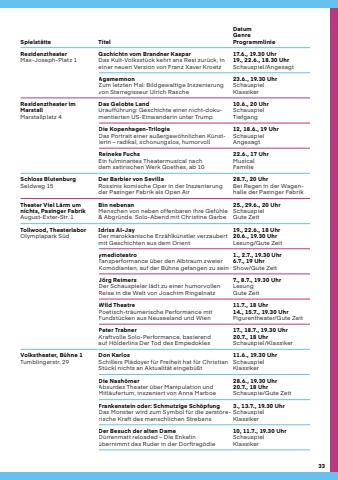 Spielst%u00e4tteTitelDatumGenreProgrammlinieResidenztheaterMax-Joseph-Platz 1Gschichtn vom Brandner KasparDas Kult-Volksst%u00fcck kehrt ans Resi zur%u00fcck, in einer neuen Version von Franz Xaver Kroetz17.6., 19.30 Uhr19., 22.6., 18.30 UhrSchauspiel/AngesagtAgamemnonZum letzten Mal: Bildgewaltige Inszenierung von Starregisseur Ulrich Rasche23.6., 19.30 UhrSchauspielKlassikerResidenztheater imMarstallMarstallplatz 4Das Gelobte LandUrauff%u00fchrung: Geschichte einer nicht-dokumentierten US-Einwanderin unter Trump10.6., 20 UhrSchauspielTiefgangDie Kopenhagen-TrilogieDas Portrait einer au%u00dfergew%u00f6hnlichen K%u00fcnstlerin %u2013 radikal, schonungslos, humorvoll12, 18.6., 19 UhrSchauspielAngesagtReineke FuchsEin fulminantes Theatermusical nach dem satirischen Werk Goethes, ab 1022.6., 17 UhrMusicalFamilieSchloss BlutenburgSeldweg 15Der Barbier von Sevilla Rossinis komische Oper in der Inszenierung der Pasinger Fabrik als Open Air28.7., 20 UhrBei Regen in der Wagenhalle der Pasinger FabrikTheater Viel L%u00e4rm um nichts, Pasinger FabrikAugust-Exter-Str. 1Bin nebenanMenschen von neben offenbaren ihre Gef%u00fchle & Abgr%u00fcnde. Solo-Abend mit Christine Garbe25., 29.6., 20 UhrSchauspielGute ZeitTollwood, TheaterlaborOlympiapark S%u00fcdIdriss Al-JayDer marokkanische Erz%u00e4hlk%u00fcnstler verzaubert mit Geschichten aus dem Orient19., 22.6., 18 Uhr20.6., 19.30 UhrLesung/Gute Zeitymedioteatro Tanzperformance %u00fcber den Albtraum zweier Kom%u00f6dianten, auf der B%u00fchne gefangen zu sein1., 2.7., 19.30 Uhr6.7., 19 UhrShow/Gute ZeitJ%u00f6rg ReimersDer Schauspieler l%u00e4dt zu einer humorvollen Reise in die Welt von Joachim Ringelnatz7., 8.7., 19.30 UhrLesungGute ZeitWild TheatrePoetisch-tr%u00e4umerische Performance mit Fundst%u00fccken aus Neuseeland und Wien11.7., 18 Uhr14., 15.7., 19.30 UhrFigurentheater/Gute ZeitPeter TrabnerKraftvolle Solo-Performance, basierend auf H%u00f6lderlins Der Tod des Empedokles17., 18.7., 19.30 Uhr20.7., 18 UhrSchauspiel/KlassikerVolkstheater, B%u00fchne 1Tumblingerstr. 29Don KarlosSchillers Pl%u00e4doyer f%u00fcr Freiheit hat f%u00fcr Christian St%u00fcckl nichts an Aktualit%u00e4t eingeb%u00fc%u00dft11.6., 19.30 UhrSchauspielKlassikerDie Nash%u00f6rnerAbsurdes Theater %u00fcber Manipulation und Mitl%u00e4ufertum, inszeniert von Anna Marboe28.6., 19.30 Uhr20.7., 18 UhrSchauspie/Gute ZeitFrankenstein oder: Schmutzige Sch%u00f6pfungDas Monster wird zum Symbol f%u00fcr die zerst%u00f6rerische Kraft des menschlichen Strebens3., 13.7., 19.30 UhrSchauspielKlassikerDer Besuch der alten DameD%u00fcrrenmatt reloaded %u2013 Die Enkelin %u00fcbernimmt das Ruder in der Dorftrag%u00f6die10, 11.7., 19.30 UhrSchauspielKlassiker33