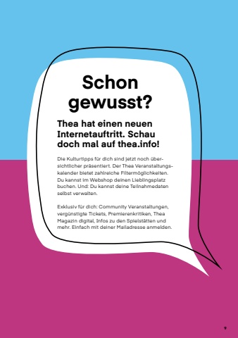 9Schon gewusst?Thea hat einen neuen Internetauftritt. Schau doch mal auf thea.info!Die Kulturtipps f%u00fcr dich sind jetzt noch %u00fcbersichtlicher pr%u00e4sentiert. Der Thea Veranstaltungskalender bietet zahlreiche Filterm%u00f6glichkeiten. Du kannst im Webshop deinen Lieblingsplatz buchen. Und: Du kannst deine Teilnahmedaten selbst verwalten. Exklusiv f%u00fcr dich: Community Veranstaltungen, verg%u00fcnstigte Tickets, Premierenkritiken, Thea Magazin digital, Infos zu den Spielst%u00e4tten und mehr. Einfach mit deiner Mailadresse anmelden.